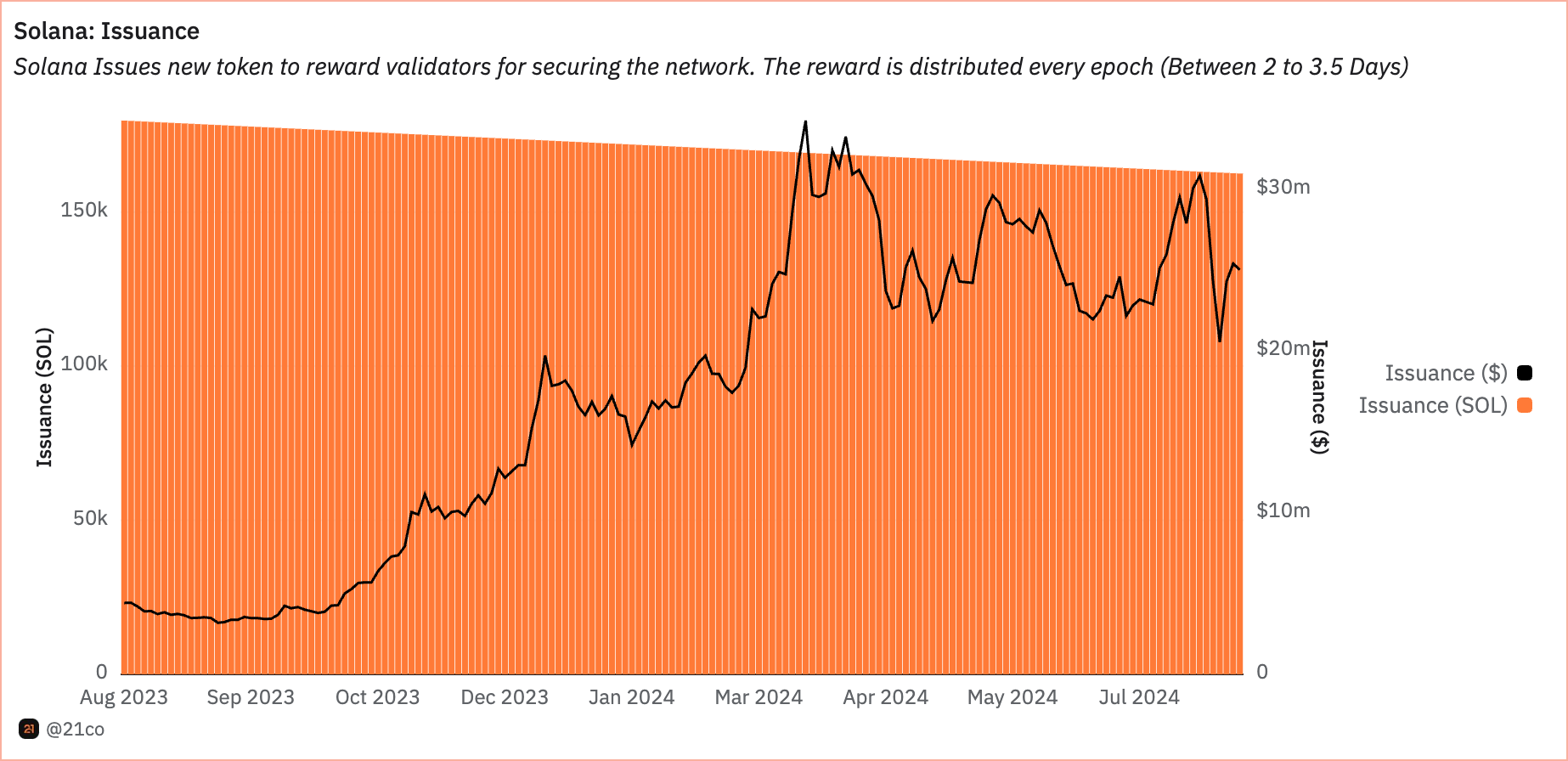 Dune-dashboardin tiedot 11. elokuuta osoittivat, että yli 162 503 SOL-tokenia, arvoltaan noin 25 miljoonaa dollaria, laskettiin liikkeelle. Nämä tokenit ovat palkkioita, jotka jaetaan validoijille verkon turvallisuuden ylläpitämiseksi. Kriitikot väittävät, että korkea liikkeellelaskunopeus saattaa lisätä myyntipainetta, mikä voi potentiaalisesti heikentää omaisuuden pitkän aikavälin arvoa.