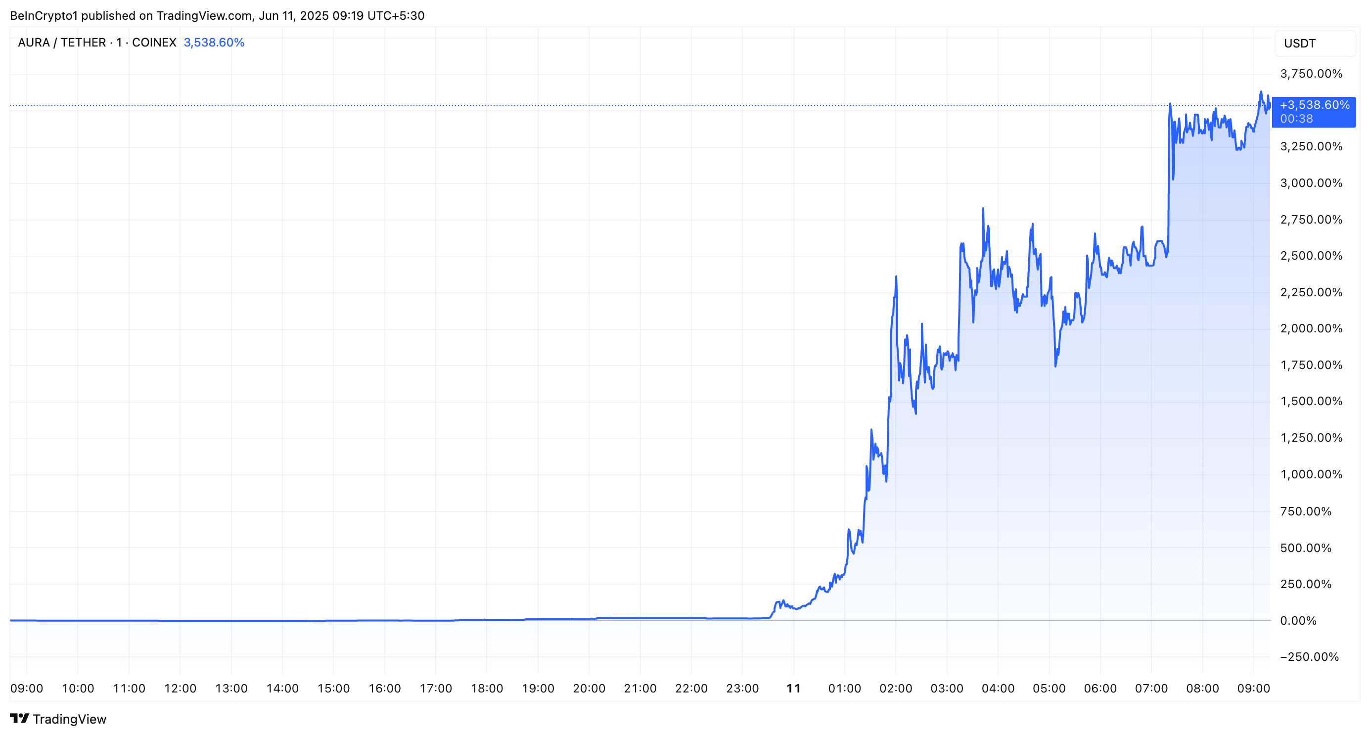 Aura (AURA), kulttuuritoken, joka on rakennettu Solana (SOL) lohkoketjun päälle, on noussut yli 3 500% viimeisen 24 tunnin aikana, mikä merkitsee poikkeuksellista hinnannousua.