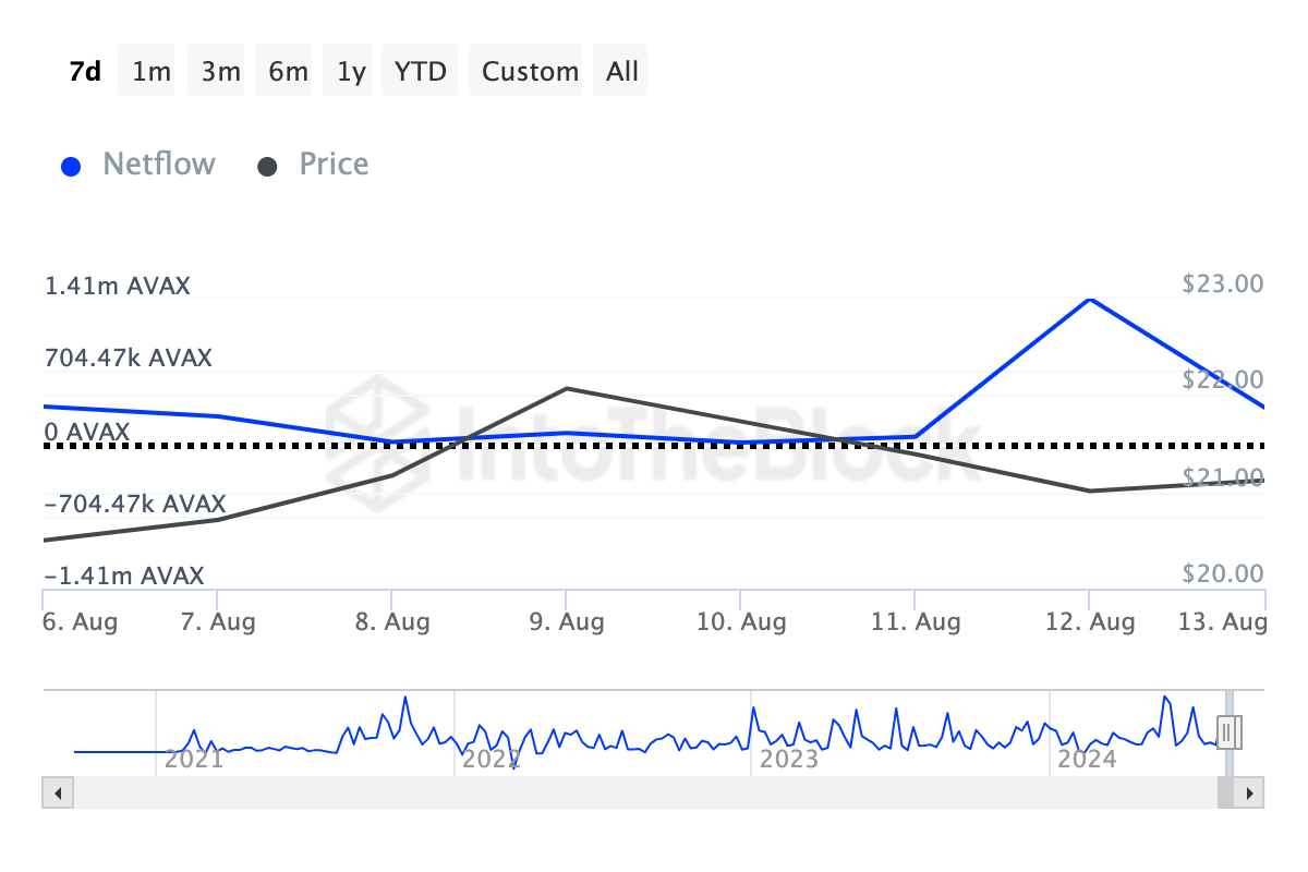 Negatiivinen rahoitus, kuten AVAX:n tilanteessa, viittaa karhumaiseen tunnelmaan, mikä osoittaa, että kauppiaat odottavat hinnan laskevan. Kuitenkin valaat näyttävät olevan eri mieltä. IntoTheBlockin mukaan suurten omistajien nettovirta Avalanchen verkossa on noussut 33,66% viimeisen seitsemän päivän aikana.