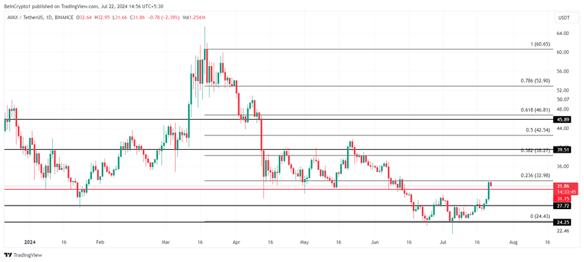 Avalanchen hinta, jonka arvo on 31 dollaria, yrittää murtautua 23,6 prosentin Fibonacci Retracement -linjan läpi 33 dollarissa. Tämä Fib-taso tunnetaan myös karhumarkkinoiden tukilattiana, ja sen turvaaminen voisi auttaa AVAXia estämään laskutrendin.
