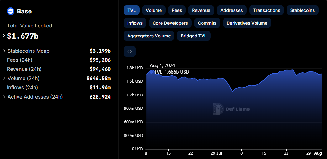 Base Total Value Locked (TVL) nousi 11 miljoonalla dollarilla viimeisen 24 tunnin aikana, 1,666 miljardista dollarista 1,677 miljardiin dollariin elokuun 1. ja 2. päivän välillä. Nousu tapahtui äskettäisten haasteiden jälkeen L2-verkossa, mukaan lukien turvallisuushuolet sen meemikolikkoprojekteista.