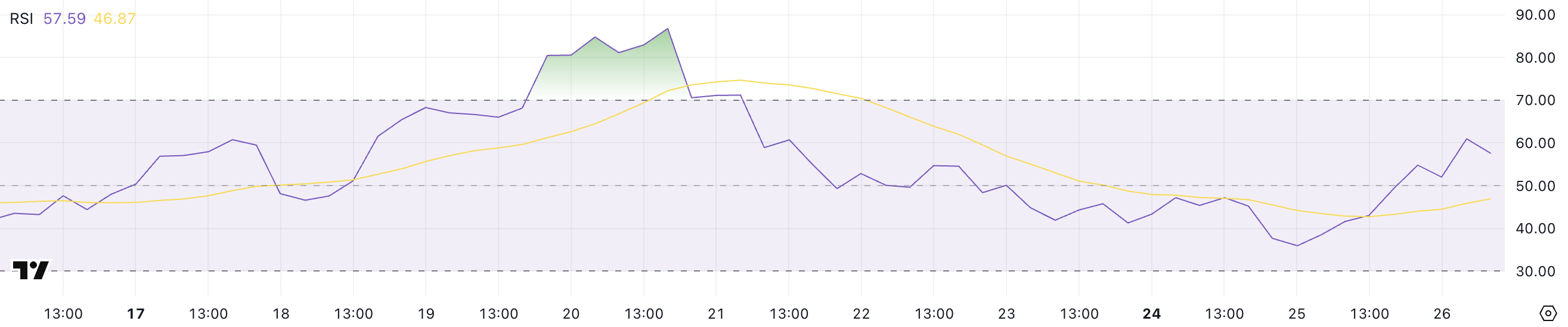 Berachainin RSI on tällä hetkellä 57,59, noussut 35,9:stä päivässä, mikä osoittaa merkittävää ostovoiman kasvua. Relative Strength Index (RSI) mittaa hintaliikkeiden nopeutta ja muutosta, vaihdellen 0:n ja 100:n välillä.
