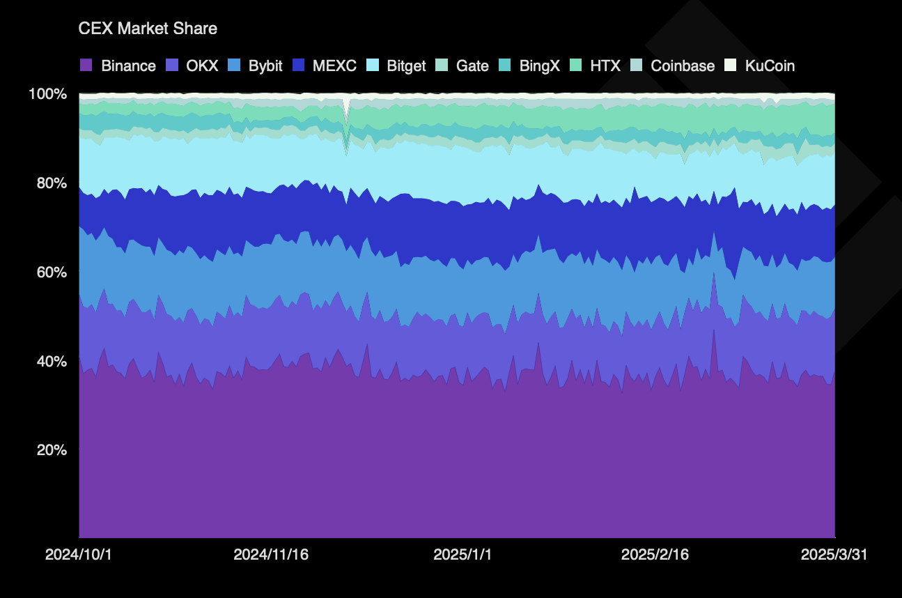 Vaihdolla oli kuitenkin vahva Q1 2025, sillä sen kaupankäyntivolyymi jatkoi hallitsemista kolmasosalla CEX-markkinoista.