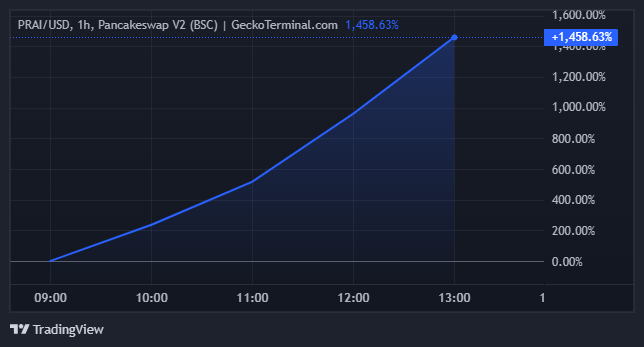TGE:n jälkeen Privasea AI:n hinta nousi yli 1 458 %. PRAI:n hinta oli 0,005939 dollaria PancakeSwap V2:ssa tätä kirjoitettaessa.