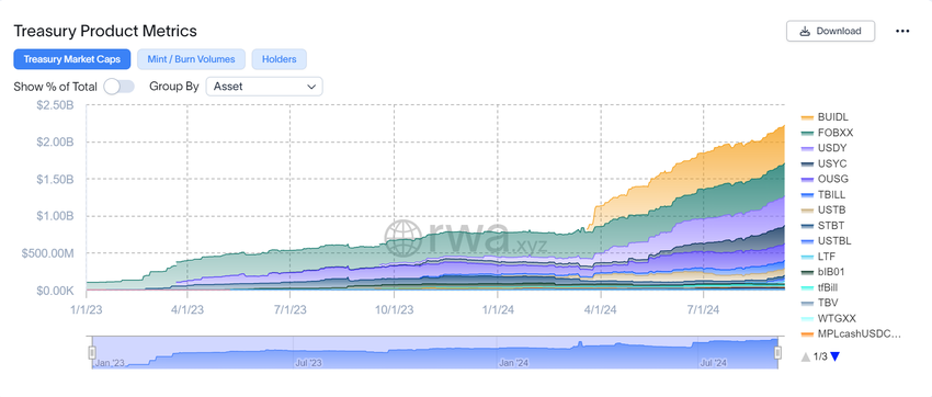 Laajemmassa markkinassa muut keskeiset toimijat, mukaan lukien Franklin Templeton ja BlackRock, ovat myös tutkineet tokenisoituja valtion velkasitoumus-ratkaisuja. RWA.xyz:n tiedot paljastavat, että syyskuuhun 2024 mennessä näiden tokenisoitujen omaisuuserien kokonaisarvo on saavuttanut 2,22 miljardia dollaria. Tämä arvon nousu korostaa niiden kasvavaa vetovoimaa yksityisten ja institutionaalisten sijoittajien keskuudessa, jotka arvostavat Yhdysvaltain valtion velkasitoumusten vakautta ja sääntelyn mukaisuutta, mikä tekee niistä suositun vaihtoehdon tokenisointiin.