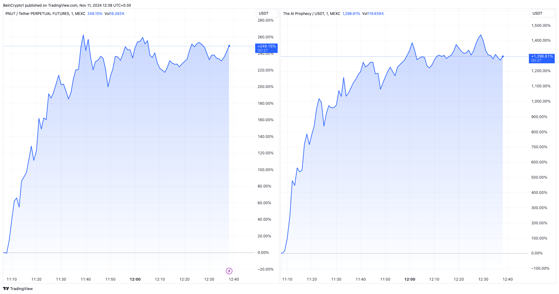 TradingView’n tietojen mukaan PNUT ja ACT ovat molemmat kirjanneet eksponentiaalista kasvua Binance-listausilmoituksen jälkeen.