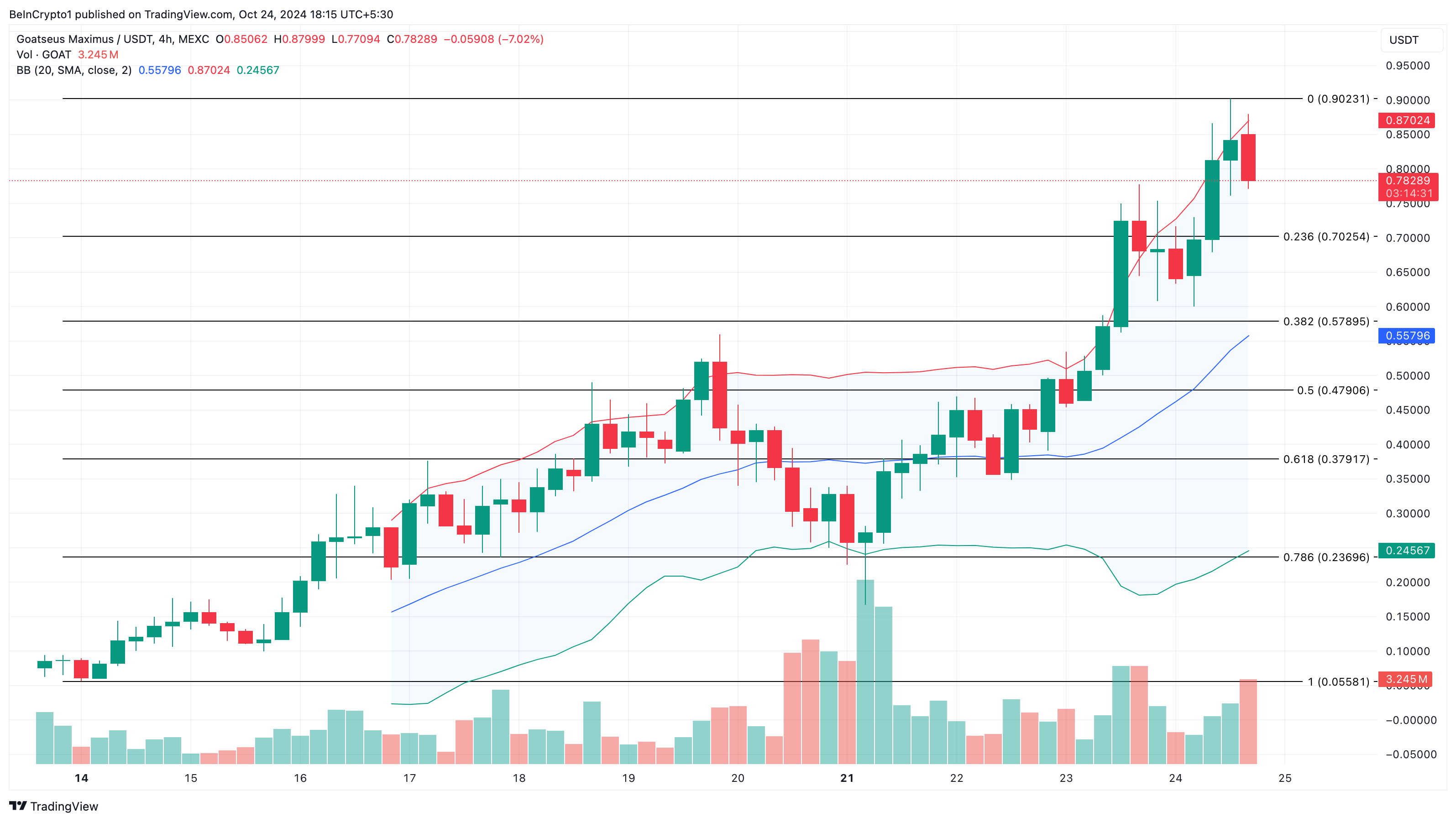 4 tunnin kaaviossa GOAT-meemikolikon hinta on vetäytynyt 0,88 dollarista ja on nyt 0,78 dollaria. Tämä vetäytyminen voi johtua siitä, että meemikolikko on yliostettu. Esimerkiksi kaavion Bollinger Bands (BB) osoittaa, että indikaattorin yläraja on koskettanut GOAT:n hintaa.