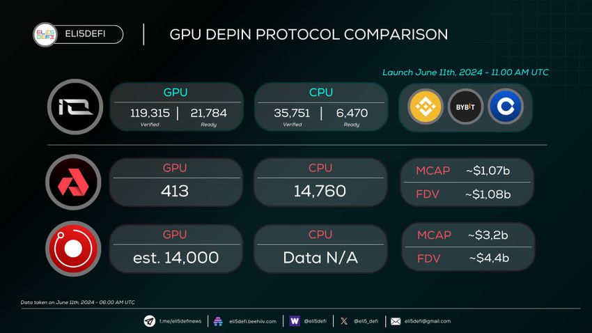 Web3-tutkija Elip5DeFi jakoi visualisoinnin, joka osoitti, että io.net omistaa 21 784 GPU: ta, ylittäen kilpailijat, kuten Render ja Akash Network (AKT), joissa on vastaavasti 14 000 ja 413 GPU: ta.