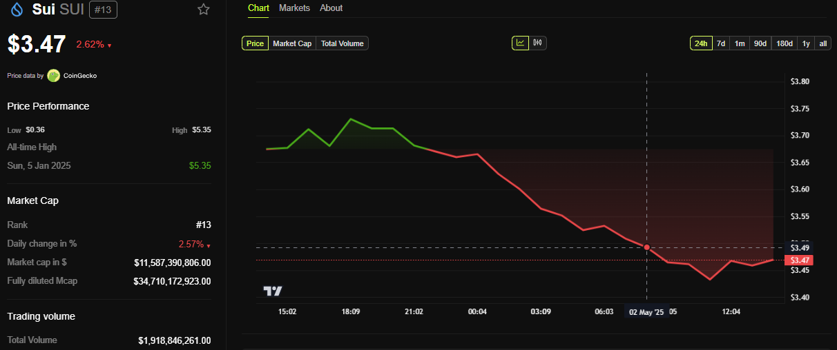 SUI-hinta on laskenut lähes 3% viimeisen 24 tunnin aikana. Kirjoitushetkellä se oli kaupankäynnissä 3,47 dollarilla.