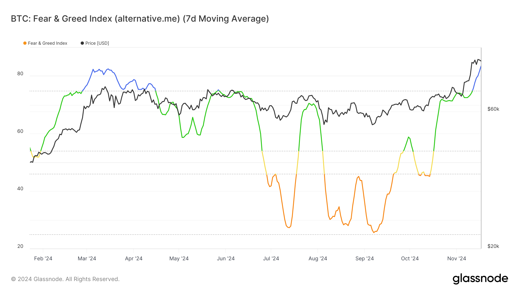 Pelko ja ahneus -indeksi, markkinatunnelman barometri, on nyt “äärimmäisen ahneuden” alueella, mikä on historiallisesti viitannut mahdollisiin käänteisiin Bitcoinin hinnassa. Äärimmäinen ahneus osoittaa usein, että sijoittajat ovat liian optimistisia, jättäen markkinat alttiiksi äkillisille myynneille.