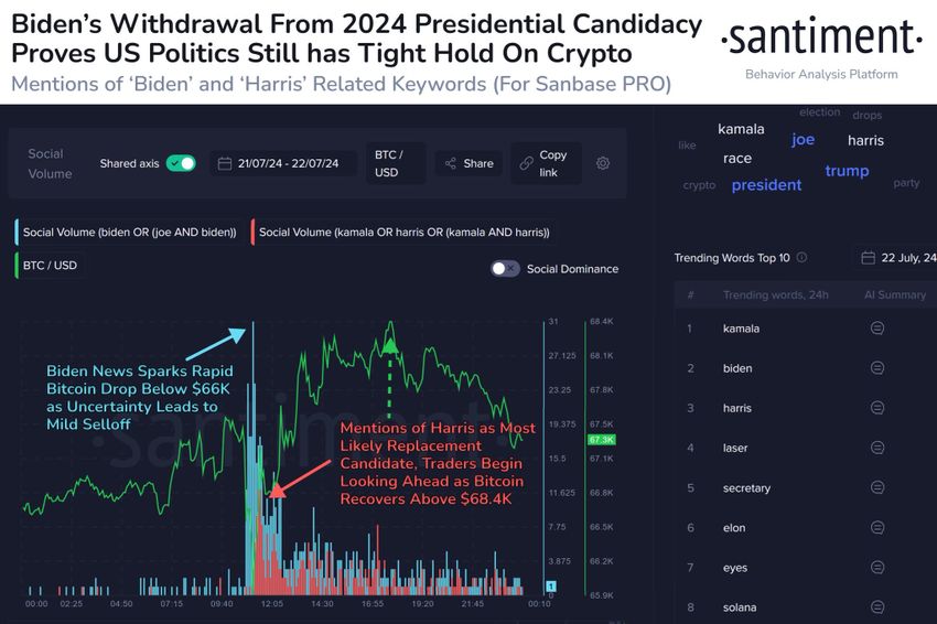 Tämän lisäksi vaalit saivat mielenkiintoisen käänteen eilen 21. heinäkuuta, kun nykyinen presidentti Joe Biden luopui tarjouksestaan. Muutama minuutti paljastuksen jälkeen Bitcoinin hintasalama romahti alle 67 000 dollarin.