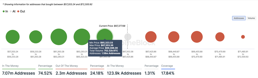 Yllä olevan IntoTheBlockin mukaan 1,58 miljoonaa osoitetta osti BTC:tä 65 323–67 353 dollarin välillä. Luku on paljon enemmän kuin osoitteet, jotka kertyivät joka pisteessä 69 425–72 500 dollarin välillä.