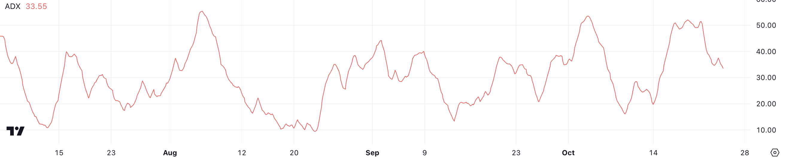 Bitcoinin (BTC) ADX on tällä hetkellä 33,55, mikä osoittaa kohtalaisen trendin voimakkuuden. Keskimääräinen suuntausindeksi (ADX) mittaa hintatrendin voimakkuutta riippumatta siitä, liikkuuko se ylös tai alas.