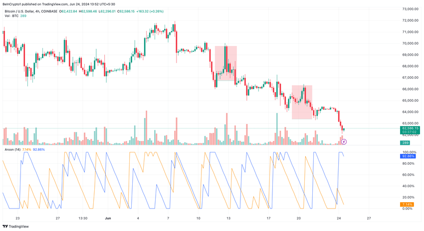 4 tunnin aikavälillä Bitcoin heijastaa mallia, joka johti hinnan laskuun 12. kesäkuuta. Näihin aikaoihin BTC laski 69 747 dollarista 66 633 dollariin. Kesäkuun 20. päivänä tapahtui sama, kun hinta laski 66 292 dollarista 63 811 dollariin.