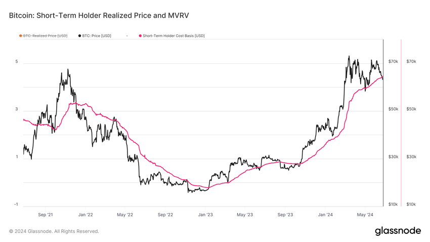 Tätä kirjoitettaessa BTC:n arvo on 62 367 dollaria. Glassnoden mukaan STH:n toteutunut hinta on kuitenkin 64 410 dollaria.