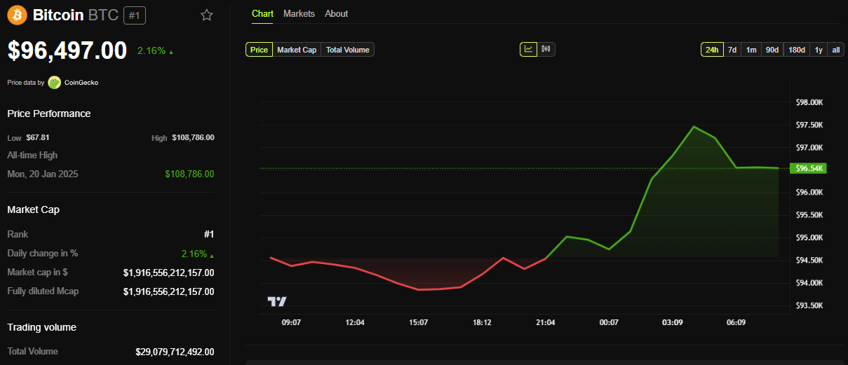 Tätä kirjoitettaessa BTC:n hinta oli 96 497 dollaria, nousua vaatimattomat 2,16 % viimeisen 24 tunnin aikana. Tämä vetäytyminen 96 000 dollarin alueelle tapahtuu markkinoiden epävarmuuden keskellä, kun kauppiaat valmistautuvat FOMC:hen myöhemmin tänään.