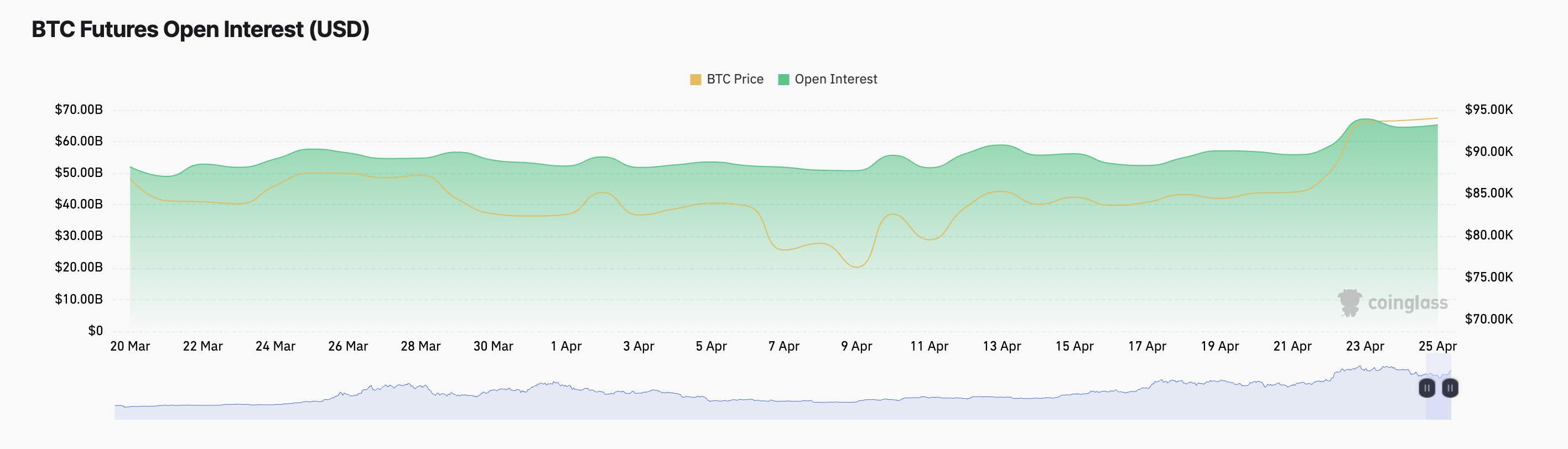 Kirjoitushetkellä tämä on 65,31 miljardia dollaria, nousua 1 % tänään. BTC:n hinnan ja Open Interestin asteittainen nousu viittaa kasvavaan markkinaosallistumiseen ja lisääntyvään luottamukseen käynnissä olevaan suuntaukseen.
