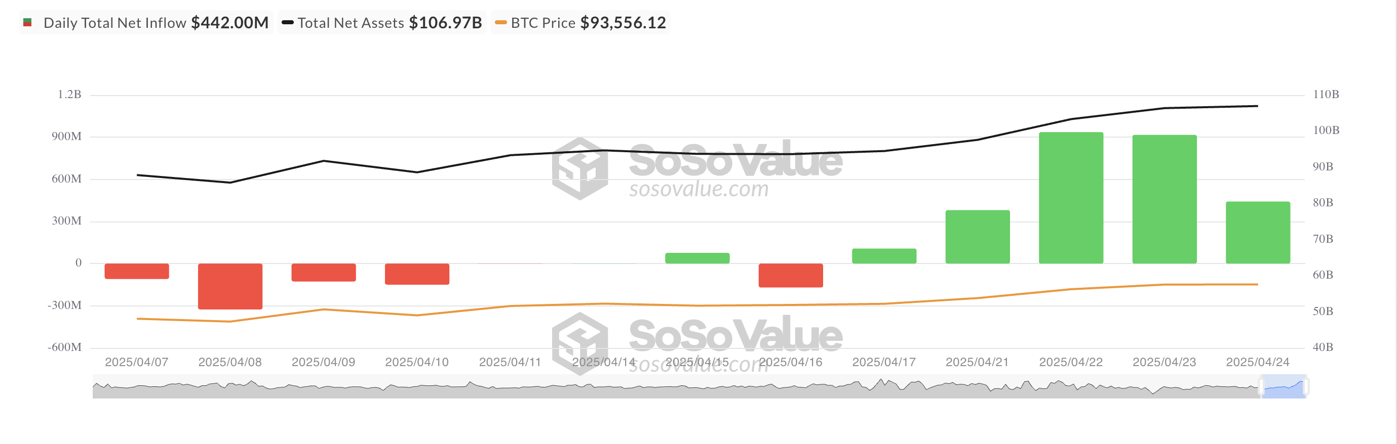 Bitcoin ETF:t kirjasivat jälleen yhden päivän nettosijoituksia torstaina, jatkaen putkeaan viiteen peräkkäiseen päivään. Viimeisin lisäys, 442 miljoonaa dollaria, nosti viikon kokonaismäärän 2,68 miljardiin dollariin, mikä on suurin viikoittainen nettosijoitus sitten joulukuun 2024 ensimmäisen viikon.