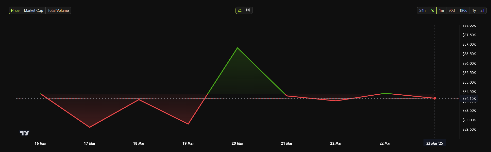 Tätä kirjoitettaessa Bitcoinin hinta on noin 84 148 dollaria. Se on laskenut vaatimattomat 0,46 % viimeisen 24 tunnin aikana, eikä heijasta optimismia Bitcoin ETF -sijoitusten viimeaikaisen nousun keskellä.