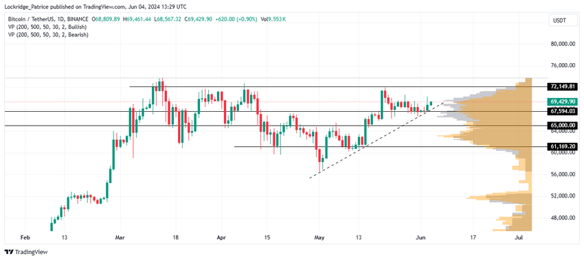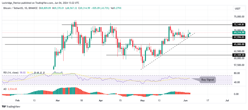 Bitcoinin hinta on jatkanut konsolidoitumistaan nousevalla trendilinjalla 1. toukokuuta lähtien, ja useita korkeampia pohjalukemia. BTC on 22 % 56 552 dollarin alimman vaihteluvälin yläpuolella, ja se näyttää olevan valmis saamaan lisää voittoja, kun se yrittää murtaa konsolidoinnin.