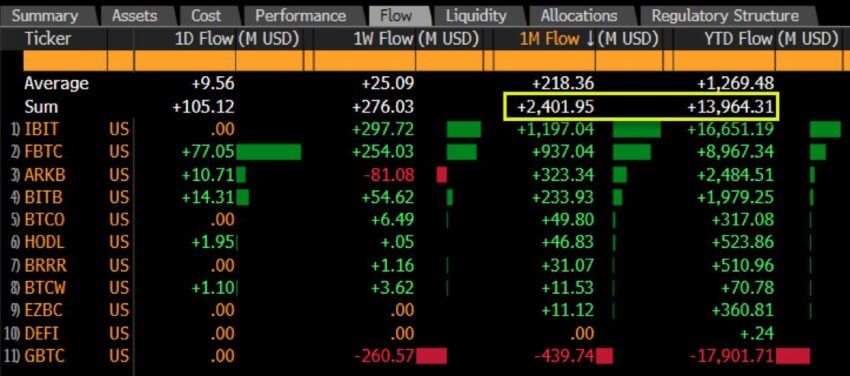 Bitcoin-ETF:t ovat saamassa vauhtia, ja raportit osoittivat maanantaina jopa 105 miljoonan dollarin positiivisia virtauksia. Tämä nostaa kumulatiiviset sisäänvirtaukset lähes 2,40 miljardiin dollariin viimeisen kolmen viikon aikana.