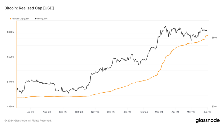 Sijoittajien luottamus on noussut huhtikuun 20. päivän Bitcoinin puoliintumisen jälkeen, mikä vahvistaa nousevaa teesiä. Tämä näkyy Bitcoinin toteutuneen pääoman nousussa, joka lähestyy 600 miljardia dollaria.