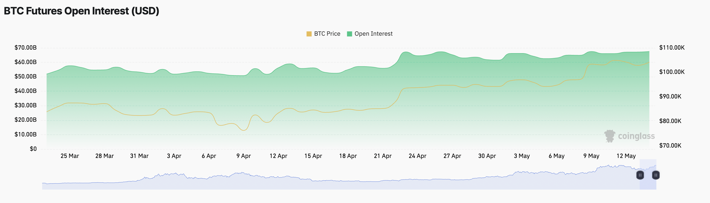 Viimeisen 24 tunnin aikana BTC on tehnyt maltillisen palautuksen, nousten 1 %. Tämä hintaralli johtuu kaupankäyntitoiminnan tasaisesta noususta viimeisen päivän aikana. Futuurimarkkinoilla tämä näkyy kolikon open interest -luvussa, joka on tällä hetkellä 67,47 miljardia dollaria, mikä merkitsee 1 % nousua.