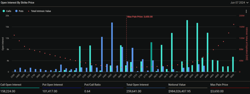 Ethereum-markkinoilla 259 641 sopimusta on päättymässä. Put-to-call-suhde on 0,64. Ethereumin suurin kipupiste on 3 650 dollaria.