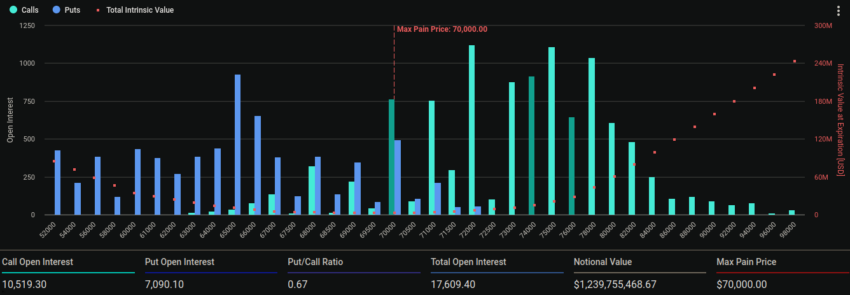 Deribitin tietojen mukaan 17 609 Bitcoin-sopimusta on päättymässä, ja puhelusuhde on 0,67. Tämä suhde viittaa ostovaihtoehtojen (puheluiden) yleisyyteen myyntioptioihin nähden.
