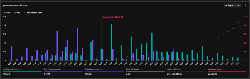 Ethereumille erääntyy 471,79 miljoonan dollarin arvosta optioita, jotka käsittävät 183 821 sopimusta — laskua viime viikon 206 626 sopimuksesta. Suurin kivun piste on 2 650 dollaria, ja put-to-call-suhde on 0,80, mikä viittaa varovaiseen markkinanäkemykseen.