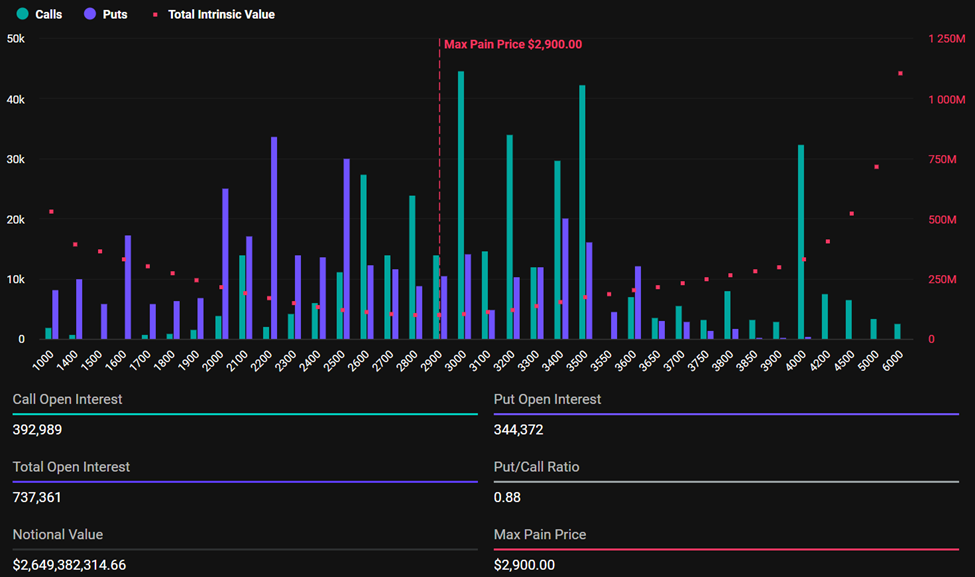 Tämän päivän Ethereum-erääntyvien optioiden maksimaalinen kipupiste tai toteutushinta on 2 900 dollaria, jolloin useimmat haltijat kokevat suurimman taloudellisen tappion.