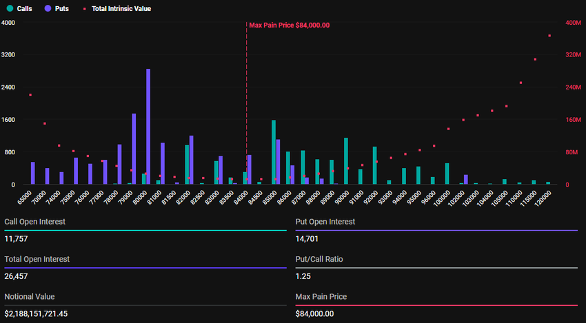 • Bitcoinin optioiden erääntyminen on put-to-call-suhteella 1,25, mikä osoittaa karhumaista tunnelmaa, kun BTC lähestyy suurinta kipupistettä 84 000 dollaria.
