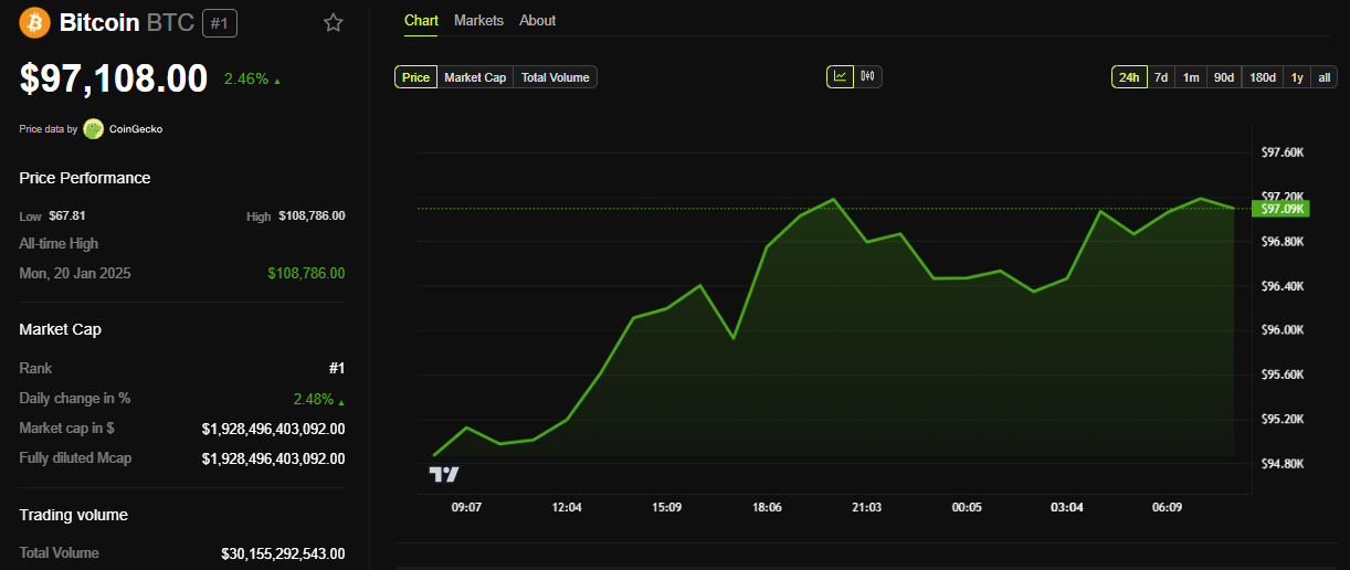 Tätä kirjoitettaessa Bitcoinin hinta oli 97 108 dollaria, ja se oli noussut lähes 3 % viimeisen 24 tunnin aikana.