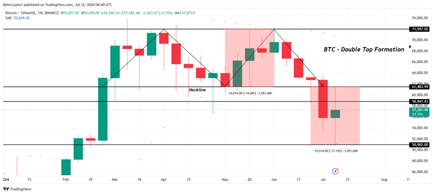 Viikonlopun aikana BTC:n odotetaan saavan vastuksen takaisin 58 847 dollariin, mikä mahdollistaisi toipumisen 60 000 dollariin. Tämän seurauksena Bitcoin välttyisi onnistuneesti kaksinkertaiselta huippumuodostelmalta odotetusta laskusta 50 900 dollariin.