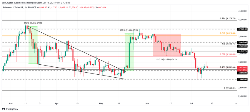 ETH saavuttaa tämän varmistamalla 3,000 dollarin tason tukilattiana. Altcoinin tavoitteena on saada takaisin 3 346 dollaria jälleen tueksi viime päivinä kokemiensa tappioiden kattamiseksi.