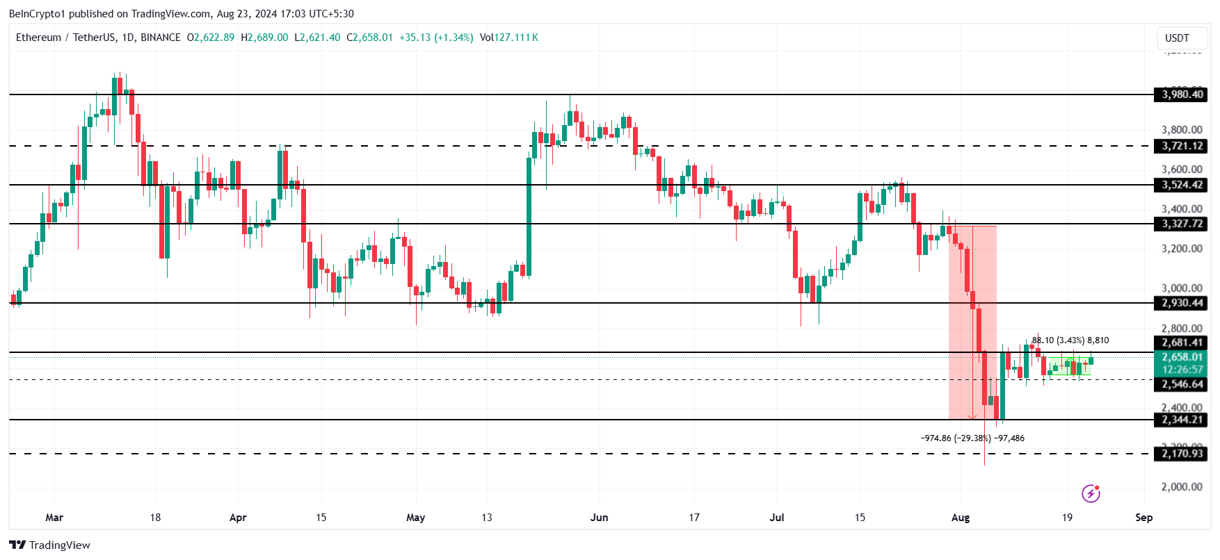 Ethereumin hinta ei onnistunut tekemään vaikutusta, kun altcoin-kuningas pysyi jumissa 2 681 dollarin esteen alla. Tämä taso on estänyt ETH:n toipumisen yli kahden viikon ajan, lisäten sijoittajien huolia huomattavasti.