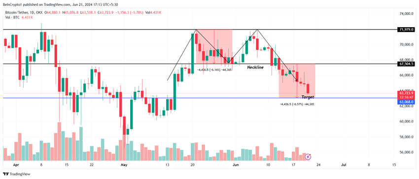 Kun BTC murtui pääntien alapuolelle, seurasi voimakasta laskua. Tämän seurauksena kryptovarat putosivat pääntieltä 67 504 dollarista 63 6723 dollarin kaupankäyntihintaan. BTC on nyt lähempänä laskevan kuvion asettamaa 63 068 dollarin tavoitehintaa ja voi saavuttaa sen viikonlopun aikana.
