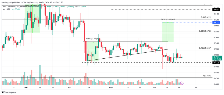 XRP:n hinta, joka liikkuu 0,47–0,52 dollarin välillä, kohtaa laskusuuntaa epäonnistuttuaan nousevassa kolmiossa. Vaihtamalla omistajaa 0,49 dollarilla altcoin voisi yrittää saada takaisin 0,51 dollaria tukilattiana, mikä kääntäisi myös 23,6 %:n Fibonacci Retracementin tueksi.