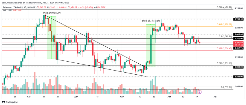 Ethereumin hinta 3 496 dollarissa on konsolidoitu 3 669–3 336 dollarin välille. Nämä tasot muodostavat 38,2% ja 50% Fibonacci Retracement -tasot. ETH on ollut tällä alueella viimeiset kaksi viikkoa sen jälkeen, kun altcoin menetti tukensa 3 700 dollarissa.