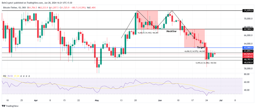 Tällä hetkellä BTC vaihtaa omistajaa 61 525 dollarissa, huomaten lievän elpymisen, ja voi jatkaa sitä. Tämä johtuu siitä, että Bitcoin osui ylimyydylle alueelle suhteellisen voimaindeksin (RSI) mukaan.
