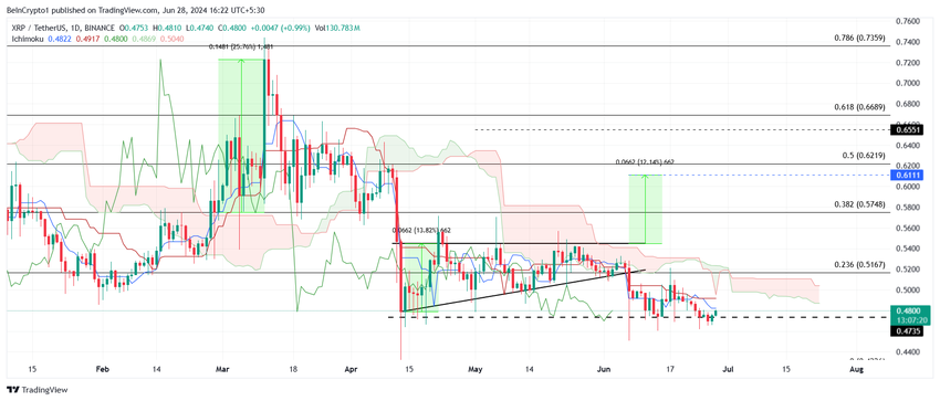 XRP:n hinta jatkaa laskuaan päiväkaaviossa epäonnistuttuaan nousevassa kolmiokuviossa. Kirjoitushetkellä altcoinin arvo on 0,4800 dollaria, ja se leijuu tiiviisti tukilattian yläpuolella 0,47 dollarissa.