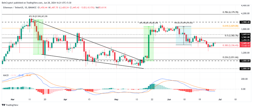 Ethereumin hinta pomppasi takaisin 38,2 %:n Fibonacci Retracementista 3 445 dollariin kirjoitushetkellä. ETH on lähellä kääntää 3 459 dollaria jälleen tueksi, mikä voisi auttaa toisen sukupolven kryptovaluuttaa työntymään kohti 50 prosentin Fib-linjaa.