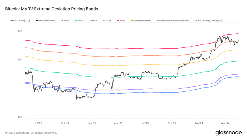 Bitcoin siirtyi äskettäin takaisin +0,5σ-hintaluokan yläpuolelle, joka on tällä hetkellä 64 600 dollaria. Historiallisesti tämän tyyppinen noususuhdanne on johtanut siihen, että Bitcoin on testannut 1,0σ:n hintaluokkaa kasvavan kysynnän tukemana. Hintaluokka on tällä hetkellä noin 77 000 dollaria.