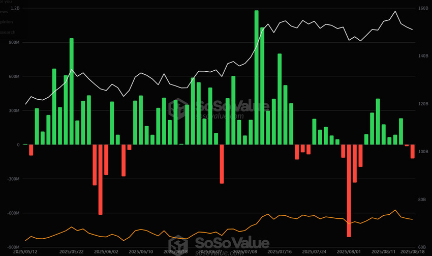 Kuitenkin 6. elokuuta alkaen, kun hintaralli alkoi, ETF:t kirjasivat seitsemän peräkkäistä päivää nettosijoituksia. Tämä suuntaus kääntyi viime torstaina, kun heinäkuun tuottajahintaindeksi julkaistiin, ja palattiin nettovirtoihin ulos. Ulosvirtausten määrä ei ollut kovin suuri, mutta Bitcoinin hinta laski jyrkästi verrattuna.