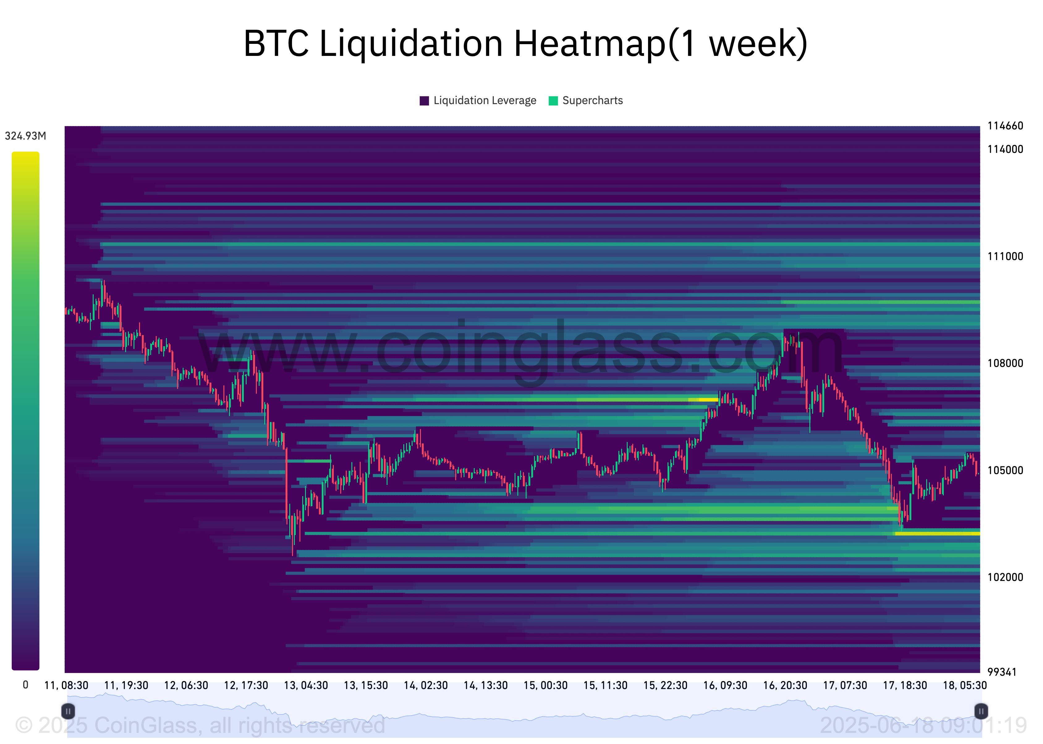 Bitcoinin hintaralli voi pysähtyä, jos geopoliittinen tilanne heikkenee entisestään, mahdollisesti liukuen kohti 103 061 dollaria. Jos likviditeettiklusteri lähellä 103 000 dollaria ei tarjoa tukea, voi seurata syvempi pudotus 101 610 dollariin.