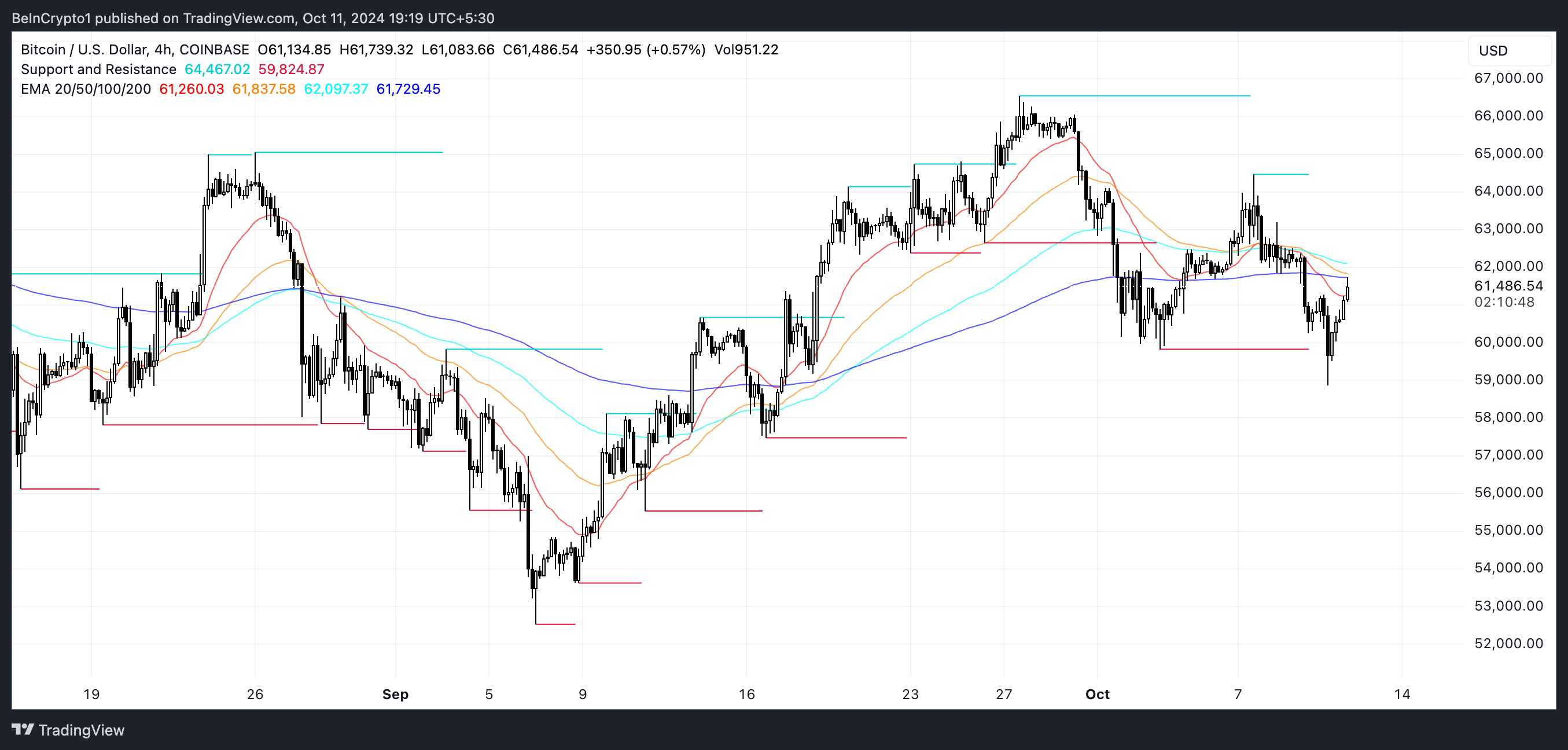 BTC:n EMA-viivat ovat tällä hetkellä karhumaisessa asennossa, lyhyen aikavälin viivat sijaitsevat pitkäaikaisten viivojen alapuolella. Kuitenkin lyhyen aikavälin viivat alkavat kääntyä ylöspäin.