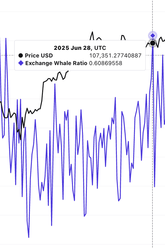 Toinen varoitusmerkki tulee valas-pörssi-suhteesta, joka seuraa, kuinka paljon BTC:tä valaat (suuret haltijat) lähettävät pörsseihin verrattuna yleiseen markkinatoimintaan.