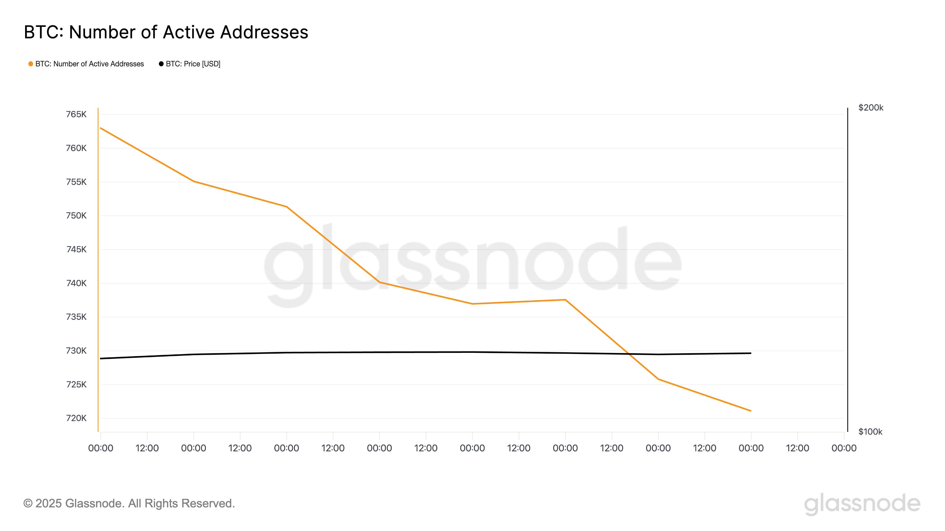 Lisäksi Glassnoden tiedot osoittavat heikkenevää lohkoketjuaktiivisuutta, mikä voisi pahentaa BTC:n laskuriskejä. Tietojen mukaan aktiivisten uniikkien osoitteiden määrä Bitcoin-verkossa on vähentynyt asteittain viimeisen seitsemän päivän aikana. Eilen se päättyi viikoittaiseen alimpaan lukemaan, 721 086 osoitetta.