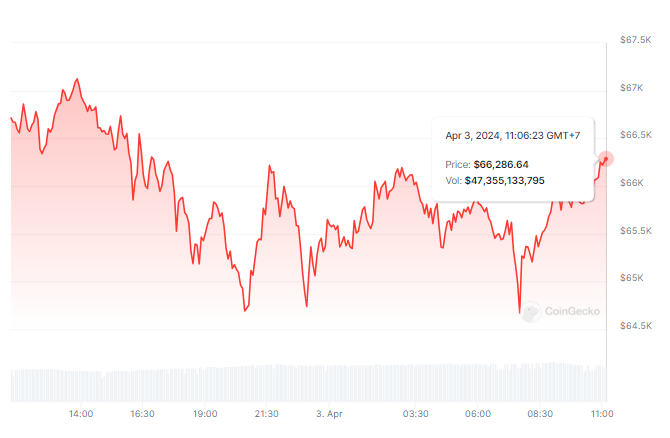 Bitcoin (BTC) jatkaa hintojensa laskua huhtikuun kolmantena päivänä. BTC:n arvo laski hetkellisesti 64 673 dollariin Aasian alkukaupankäynnin aikana. Tästä huolimatta havaittiin pientä elpymistä, ja kryptovaluutta kävi kauppaa 66 286 dollarilla tätä raporttia laadittaessa.