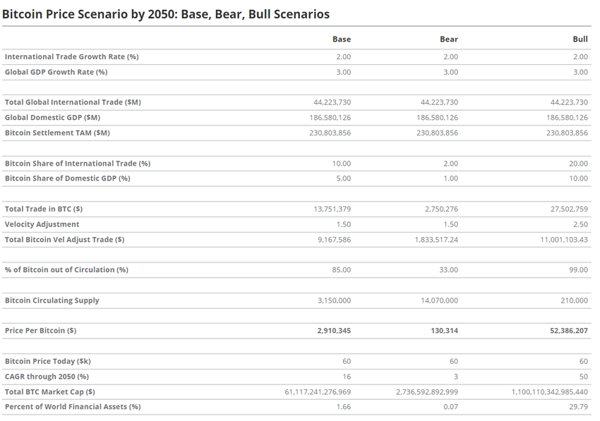 VanEckin ennuste Bitcoinista perustuu yksityiskohtaiseen analyysiin maailmankaupasta, BKT:n kasvusta ja Bitcoinin rahallisesta nopeudesta. Yrityksen malli olettaa, että Bitcoin kehittyy keskeiseksi kansainväliseksi vaihtovälineeksi. Lisäksi siitä odotetaan tulevan yksi maailman tärkeimmistä varantovaluutoista vuoteen 2050 mennessä.